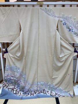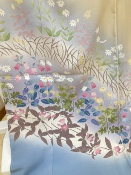 日本を代表する三大友禅(京友禅、加賀友禅、江戸友禅)はほぼ江戸時代中期に完成されたといわれます。このお品は京都の職人が加賀友禅の技法で作成したと思われます。刺繍や箔などの装飾を使わず、色彩の力で染め上げられています。