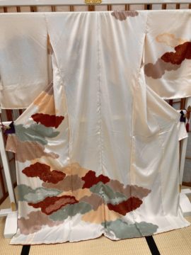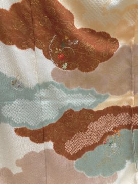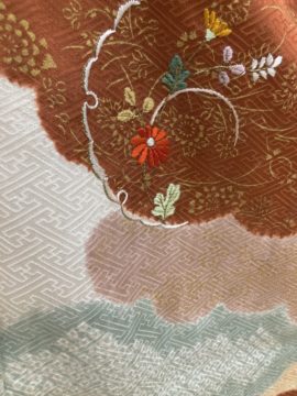 友禅染の技法が発明される前、安土桃山時代のわずかな期間に花開いたきもの。代表的なものに辻が花染め、刺繍、絞り、箔加工などの絢爛豪華なものがあげられます。こちらのお品は、あえて友禅を使わず絞り、刺繍、箔加工と大変手間のかかる技術で作成されています。当時と同じ時代に生まれた唐織の袋帯などと合わせて、桃山の美を楽しんでください。