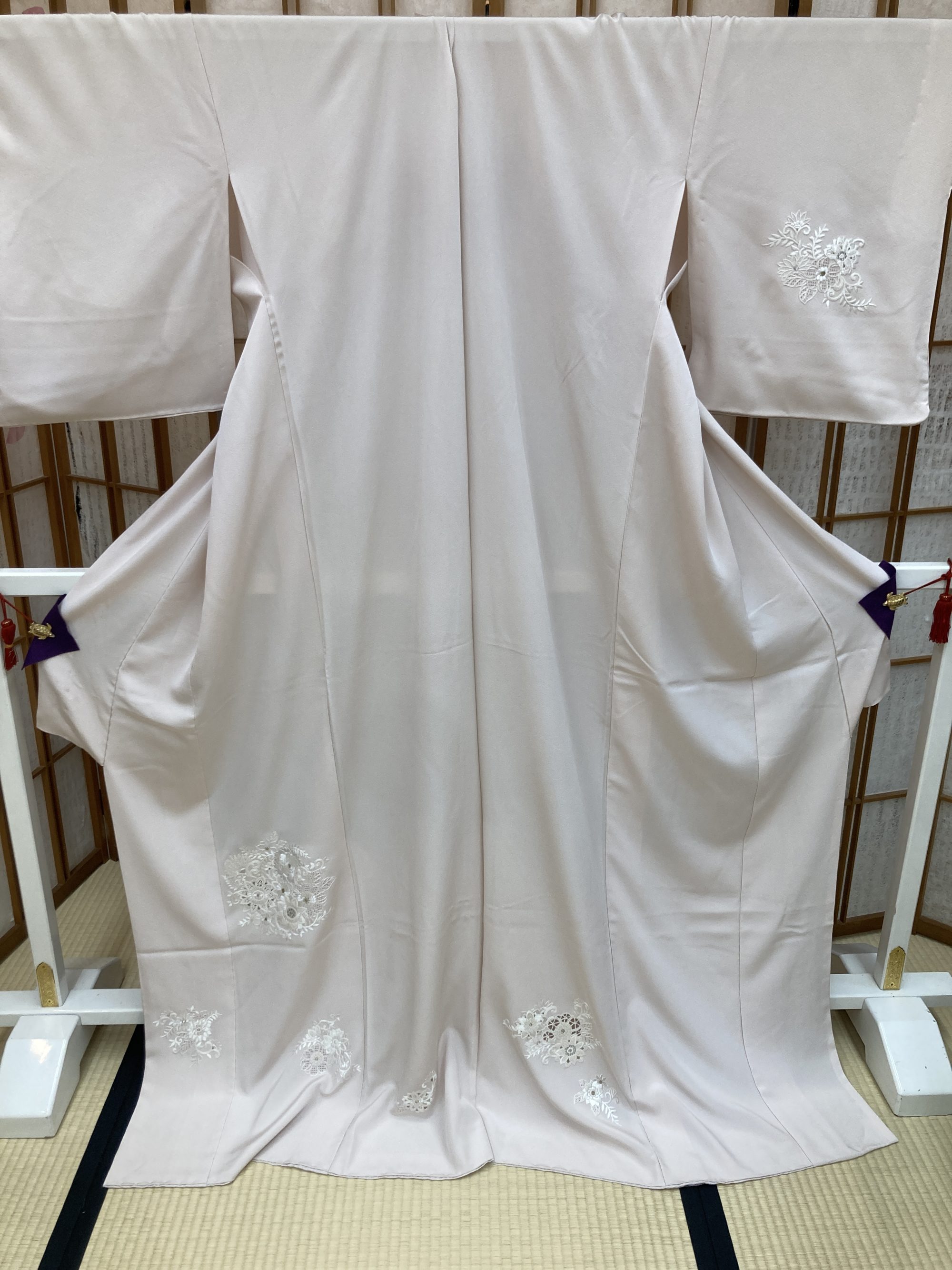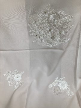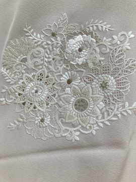 このお品は、生地と染めを日本で作成し、ベトナムの刺繍工房にて手刺繍を施しております。特にドロンワークという難しい技術を使いました。