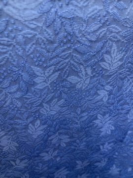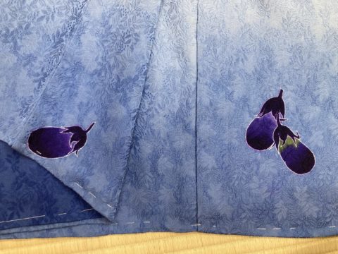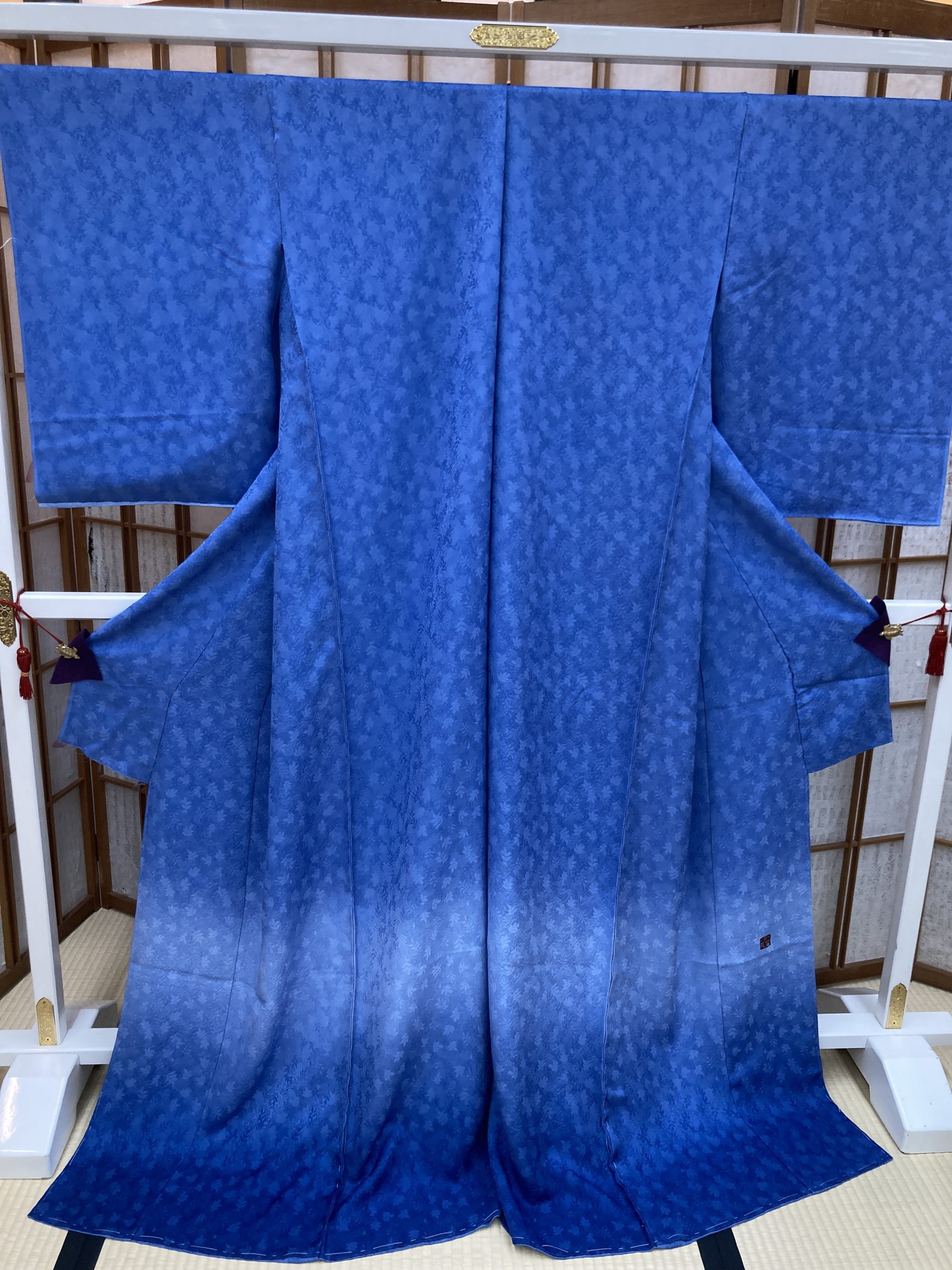 生地の地紋に南天を織出し、地色にジャパンブルー藍色でぼかし染めをし、八掛の裏地に茄子(成す)を描いてみました。海外でも日本の文化を伝えたくて作りました千歳屋のオリジナル訪問着です。帯次第で、半幅帯でも袋帯でも、場合によっては、革のベルトにブーツなどを合わせても。いかがでしょう?